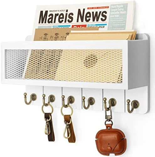 - 【Multi-purpose Key Holder】 This key rack comes with 6 vintage metal hooks for hanging keys, hair bands, masks or hats, and it’s also designed with a spacious mail rack, perfect for storing your envelopes, mail, magazines, newspapers or other small accessories like sunglasses or decorative plants!