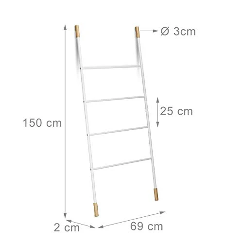 Relaxdays Metal Towel Ladder Rack, 4 Rungs, Freestanding Leaning Laundry Holder, Bamboo, 150x70x2cm, White