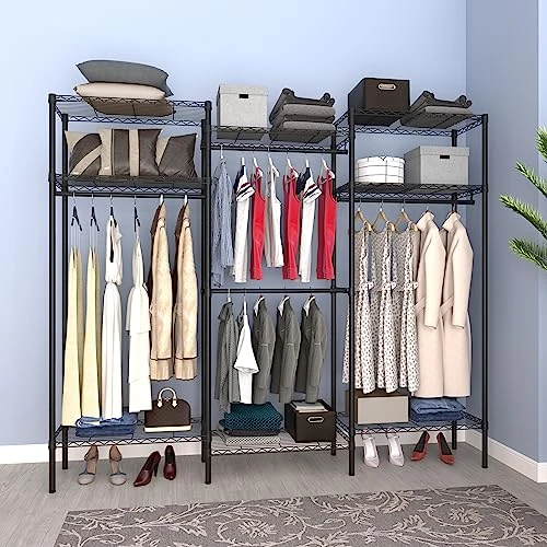 - MULTIFUNCTION: 8 Tiers Closet Rack,4 detachable hanging rod he storage area, ensure you enough space to place your clothes, accessories, bedding, lining, shoes, etc,hanging rods hold up to 80 lbs for each, it is great for hanging suits, coats, long dresses, jackets, pants, shirts or other heavy clothes.