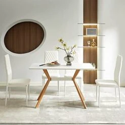White Dining Table, Simple Modern Kitchen Table With Metal Shelf&Transfer Legs, Office Table, White