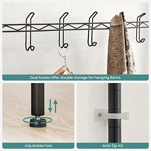 - High Stability: A strong steel structure and reinforced parts form this sturdy coat rack with shelves, capable of holding up to 44 lb on the bottom shelf, 11 lb on the top shelf, and 2.2 lb on each hook