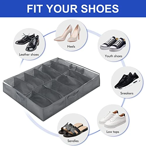 - Large Capacity Storage: One organizer lets your store 12 pairs of shoes (12 each). Each compartment can fit up to 12.5-inch shoes, except for boots. Its dimension is 31.5in*25.6in*5.9in(80cm*65cm*15cm). fits up to size 12.5in