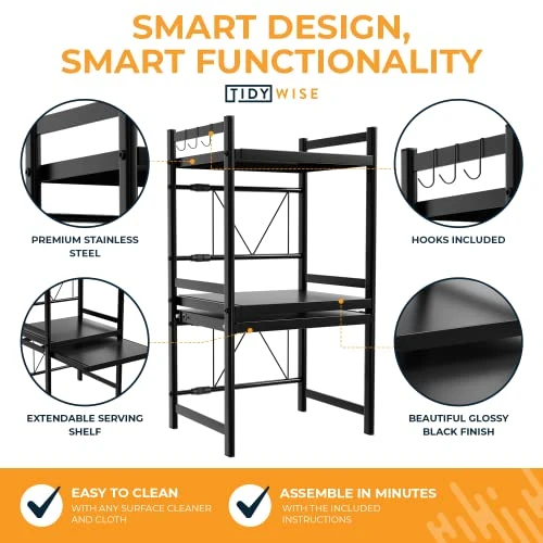 - SUIT YOUR KITCHEN STORAGE NEEDS by adjusting the counter shelf width and height. Simply loosen the adjustment knob on this countertop microwave stand and effortlessly adjust the width from 16” to 24”