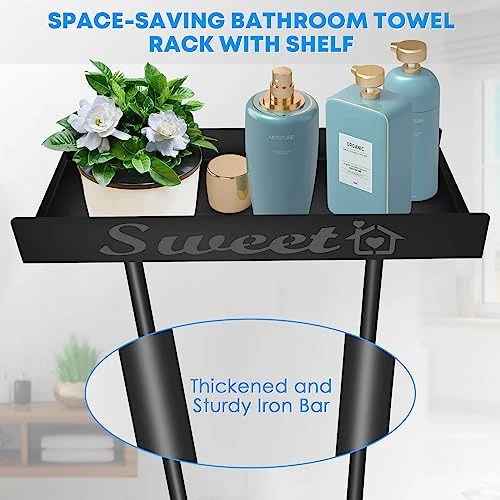 - 【Upgraded Towel Rack with Shelf and 3 Hooks】The towel shelf at the top is designed not only to storage small towels and bathroom products, but also the “Sweet” Logo & “Home” Icon to add eye-catching deco to your bathroom wall. The 3 hooks on the bottom can hang towels, bath balls, clothes, etc. to separate dry and wet towels. This elegant wall mounted towel rack is the perfect solution to free up closet space while meeting all your bathroom towel storage needs.