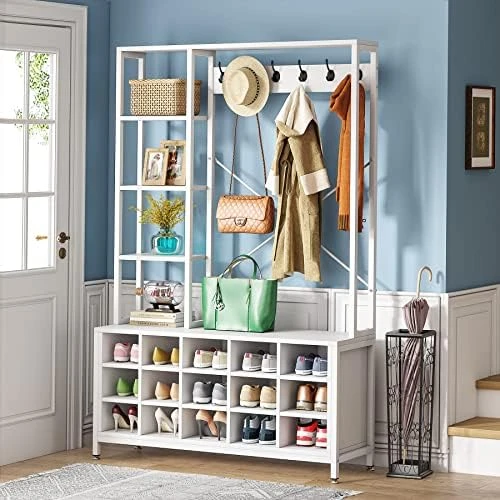 - [ Large Capacity Hall Tree ] – Size: 47.2″ W x 13.7″ D x 70.8″ H. Our hall tree shoes bench holds up to 15 pairs of shoes, meet most needs of shoes and coat storage. 6 Double Hooks to hang your bags, jackets, backpack, umbrellas, keys, and other items. 4 side shelves & top shelf provide plenty room for storage or decorations, It really covers your whole family’s demand