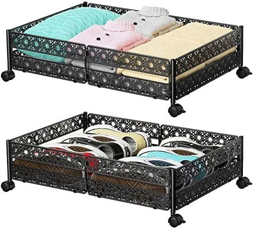 - 👍[360°Rotating Wheels] The added feature of wheels allows this under bed storager container to easily pull out for bedroom organization. Two of the 4 wheels can be locked by pushing the knob above it to fix the cart in position, the elevated design shields stored items from dust and dirt, and the unique carved floral pattern which makes you easily identify contents through the side frame even under the bed.