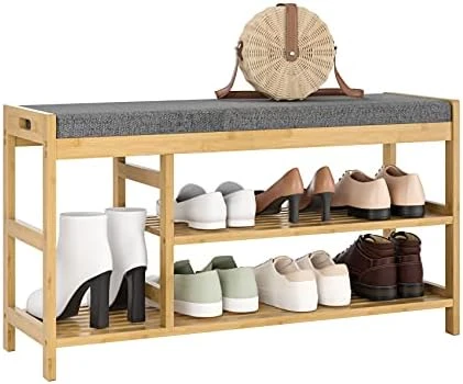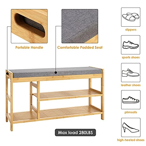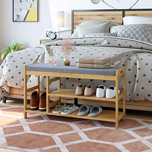 - Superior Materials: Thanks to its compact and sturdy solid bamboo frame, this padded bench can hold up to 270 lbs and is long-lasting to use; Plus, the slatted shelves have gaps to avoid a smelled by storing shoes