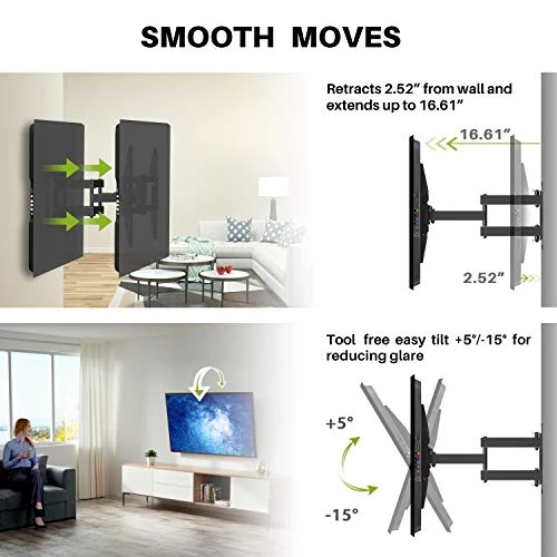 - Full Motion TV Mount: This Full motion TV mount includes +5°/-15° tilt to reduce glare, ±45°swivel, level adjusts ±4° for maximum viewing flexibility. All these will make you find the most comfortable and healthiest viewing position. (note: max. swivel angle depends on screen size)