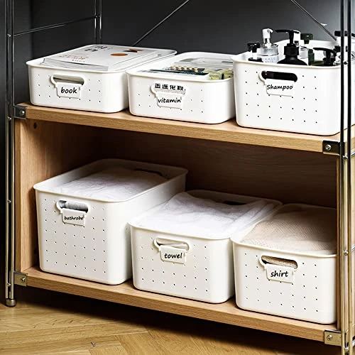 - 🏠【3 Efficient Size For Daily Use】Includes 3 white baskets and 3 lids. One 18.3L, 13.8*10*8 inch. One 13.7L, 13.8*10*6 inch. One 9.1L, 13.8*10*4 inch. THREE different size plastic organizer baskets can be used to store many types of items. Different capacity meets your different daily needs.