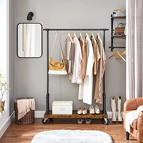 - Moving or in Position: Slide this garment rack with 4 wheels to a dressing mirror for checking out your outfit, lock it in place when you complete your morning routine, or roll it around backstage for handling numerous costume changes
