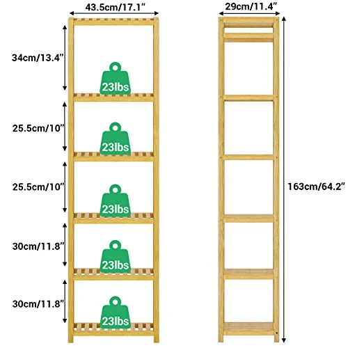 - 【STURDY & DURABLE CONSTRUCTION】The wood shelf is made of natural bamboo, which has strong toughness and wear; It is durable after WHOLE BOARD PROCESSING and high-temperature carbonization (200℃); 3 POLISHING PROCESSES and VARNISH TREATMENTS makes the bamboo shelf surface SMOOTH, WATERPROOF and EASY CLEAN; The bearing capacity of each shelf is 23lbs. It is sturdy and sustainable enough to hold your daily necessities.