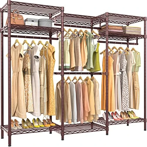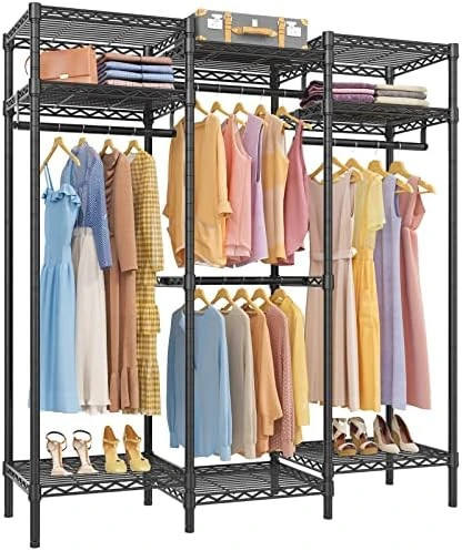 - MULTIFUNCTION CLOSET RACK: Muti-style assembly, customize the storage space to your needs. 5 Tiers Adjustable Wire Closet Rack maximize the storage area, ensure you enough space to place your clothes, accessories, bedding, lining, shoes, etc. The 4pcs clothes hanging rods are great for hanging suits, coats, long dresses, jackets, pants, shirts or other heavy clothes.