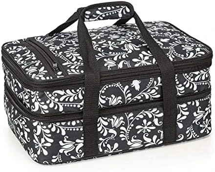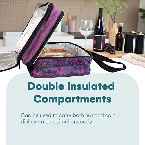- Each casserole bag has a large main compartment on the bottom and an expandable top compartment. Easy to carry handle and exterior zippered pocket for holding serving utensils or napkins, etc.