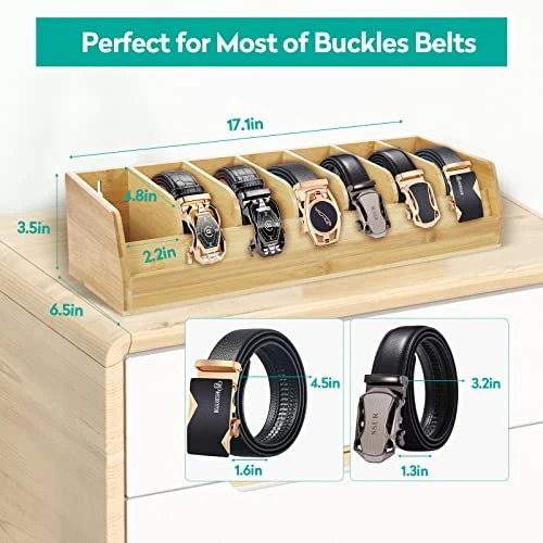 - 【7 COMPARTMENTS BELTS ORGANIZER】 The belt holder is designed with 7 compartments, each 2.2 inches apart and 3.5 inches high, which make it perfectly accommodates regular size and large-size belts or buckles, you can store more belts.