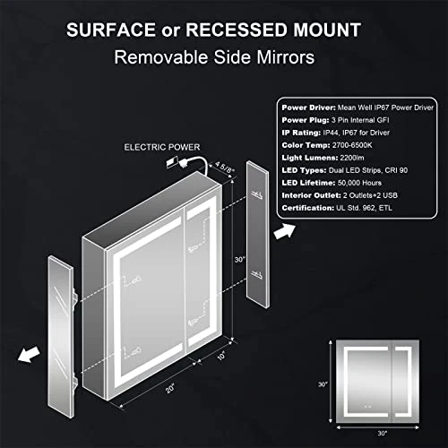 - High-tech Defog Mirror: (30 X 30 X 4 5/8 INCH ) large-size high-tech and anti-fog pad provides better defogger performance. Anti-fog function is separate controlled and anti-fog power will be automatic shut off after 1 h, safe and energy-saving. Plus, Eco-friendly waterproof copper free clear silver coated mirror glass. Making it a sleek and stylish yet very durable mirror cabinet.