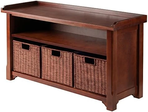 - Shelf is 34.49″W x 12.32″D x 5.51″H. Includes 3 Wire Walnut Baskets 11″W x 10″D x 9″H.