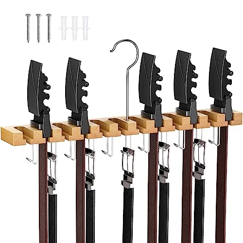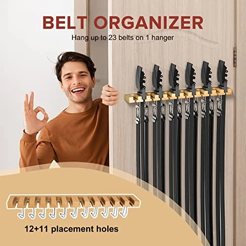 - WOOD BELT HANGER – Made of solid wood and metal hooks, durable, non-slip design, easy to use and no damage to your belts. The belt rack wood frame measures 2.36″ H x 15.3″ W x 2.16″ D, a compact size for any space. Ideal belt organizer for closet or door storage.