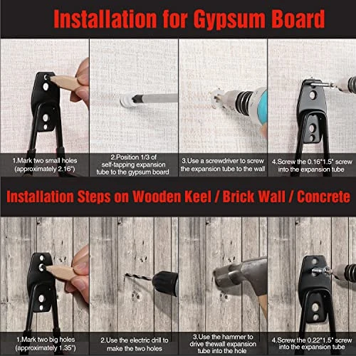 - Easy to Install: The heavy-duty garage wall hook can be easily placed on gypsum board, wooden keels, brick walls, and concrete surfaces just with a drill and screwdriver. Please refer to our instructions. Loading capacity depends on different types of walls and whether they are properly fixed.