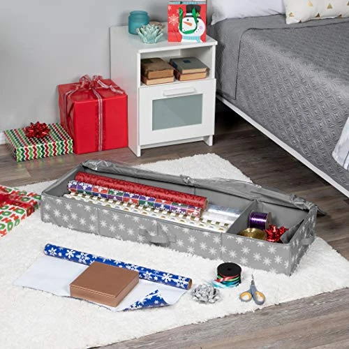 - STAY ORGANIZED WITH AN ALL-IN-ONE HOLIDAY WRAPPING SUPPLY CONTAINER: If you’ve been looking for a place to store and keep all of your holiday supplies in one place after the holidays or someplace to store birthday and special occasion wrapping supplies then your search is over! Grey snowflake design for Christmas cheer, our product has two deep pockets and plenty of space for your ribbons, tools, and tape which means that you can store your holiday wrapping supplies in one container, guaranteed!