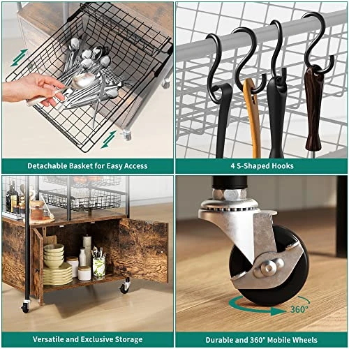 - CONSIDERATE DESIGNS: 2 pull-out baskets can hold wines, bowls & dishes for easy access & better ventilation; and side hanging wire with 4 hooks also allows you to hang utensils, spoons, towels to help you work more efficiently.
