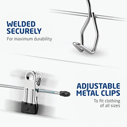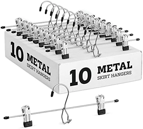 - METAL CLIPS – More room, less wrinkles – the attached clips on this hanger set can be adjusted to meet your needs, creating a seamless and smooth way to organize all of your skirts, jeans, and pants.